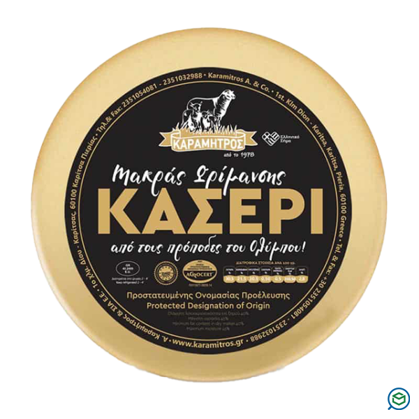 Κασέρι Π.Ο.Π. ΜΑΚΡΑΣ ΩΡΙΜΑΝΣΗΣ της οικογένειας Καραμήτρου. Παράγεται από 100% ελληνικό πρόβειο γάλα. Εκλεκτό τυρί Π.Ο.Π. Συσκευασίες: 9 kg κεφάλι 4,5 kg κεφάλι αεροστεγής συσκευασία 2,5 kg κεφάλι αεροστεγής συσκευασία 300 g κεφάλι αεροστεγής συσκευασία