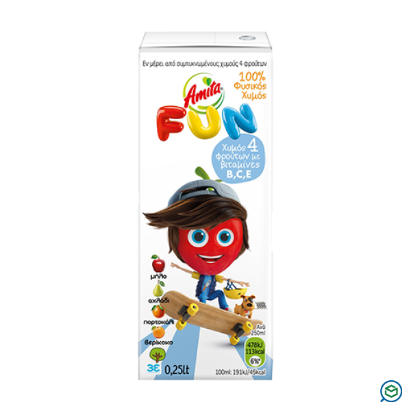Χυμός 4 φρούτων, εν μέρει, από συμπυκνωμένους χυμούς φρούτων. Με βιταμίνες B, C, E.