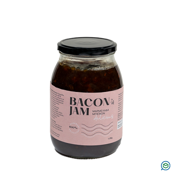 Συστατικά: Κρεμμύδια, Ζάχαρη, Νερό, Μπέικον 8% [(κρέας (87%) (κρέας χοιρινό), νερό, αλάτι, ορός γάλακτος σε σκόνη, δεξτρόζη, μπαχαρικά, σταθεροποιητής: Τρι- και δι- φωσφορικό νάτριο, αντιοξειδωτικό: ερυθορβικό νάτριο, ενισχυτικό γεύσης: γλουταμινικό νάτριο, δυνατρικα ριβονουκλεοτιδια αρτυματα καπνιστων τροφιμων, εκχυλισματα μπαχαρικων, καρυκευματα, συντηρητικό: νιτρώδες νάτριο. Μπορεί να περιέχει ίχνη σόγιας, ξηρών καρπών, σέλινου και σιναπιού)]. Ηλιέλαιο, Κρασί Κόκκινο, Πηκτίνη, Άρωμα Μπέικον, Υγρός καπνός, Πιπέρι Μαύρο.
